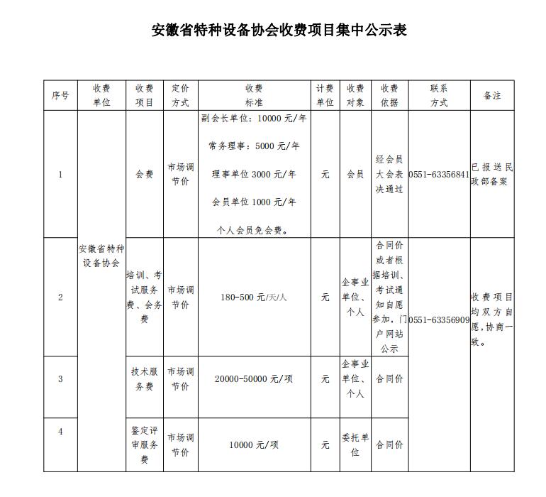 安徽省特种设备协会收费项目集中公示表